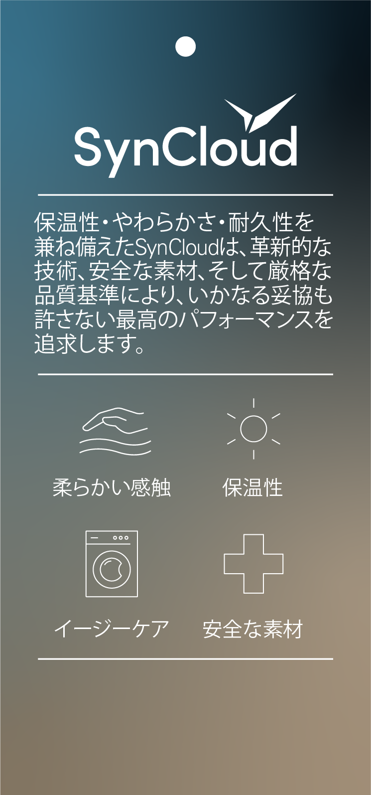 SynCloud Lは、プレミアムマイクロファイバーを使用し、柔らかさと優れた保温性、復元力を兼ね備えた充填材です。